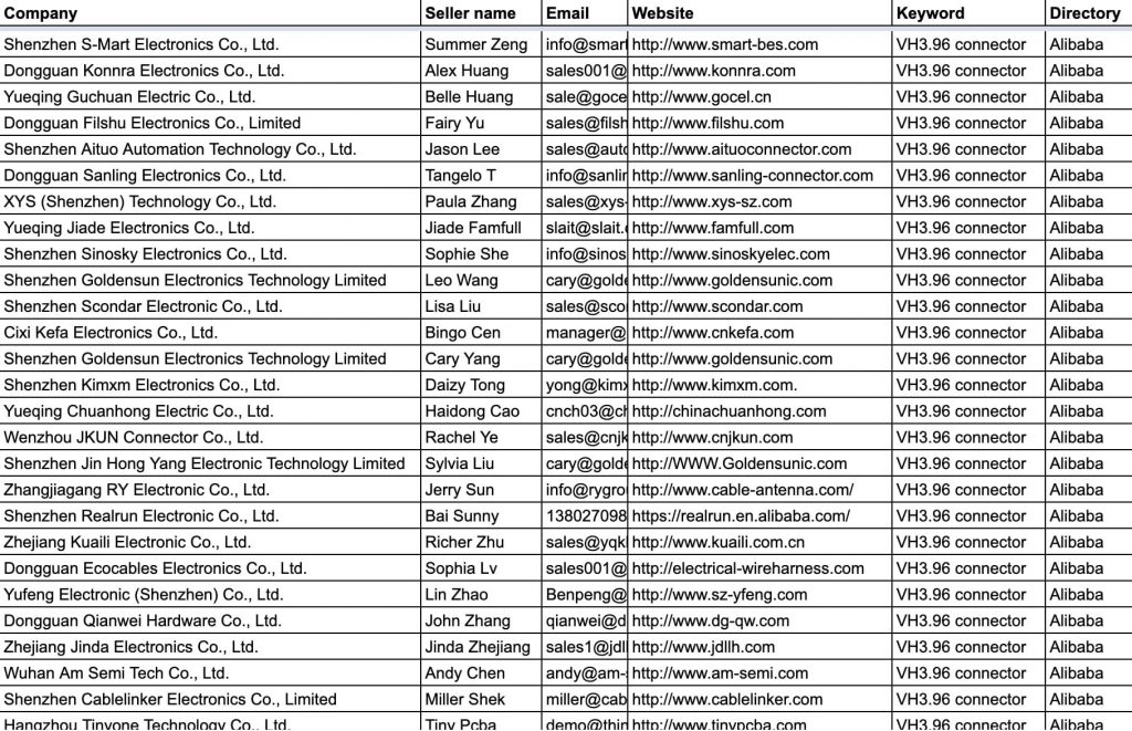 We go to websites that are business directories, like alibaba.com and conduct a search for the product you require based on your requirements. Then we put these companies’ details in a spreadsheet including company name, sales person, email address, directory from which we obtained it as well as the keyword(s) used to find them and their website link if they have a website listed.